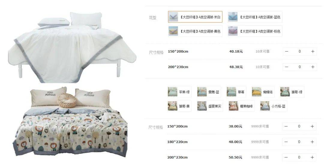 值得关注的是,这款商品的SKU非常多,不仅颜色款式选择多,而且被子的尺寸也有多样选择。商品SKU多的好处在于可以为消费者提供更加多元化的选择,满足消费者个性化的购物需求。不同的SKU可以涵盖不同的规格、款式等,有利于提升消费者下单的几率,有更多的转化机会。