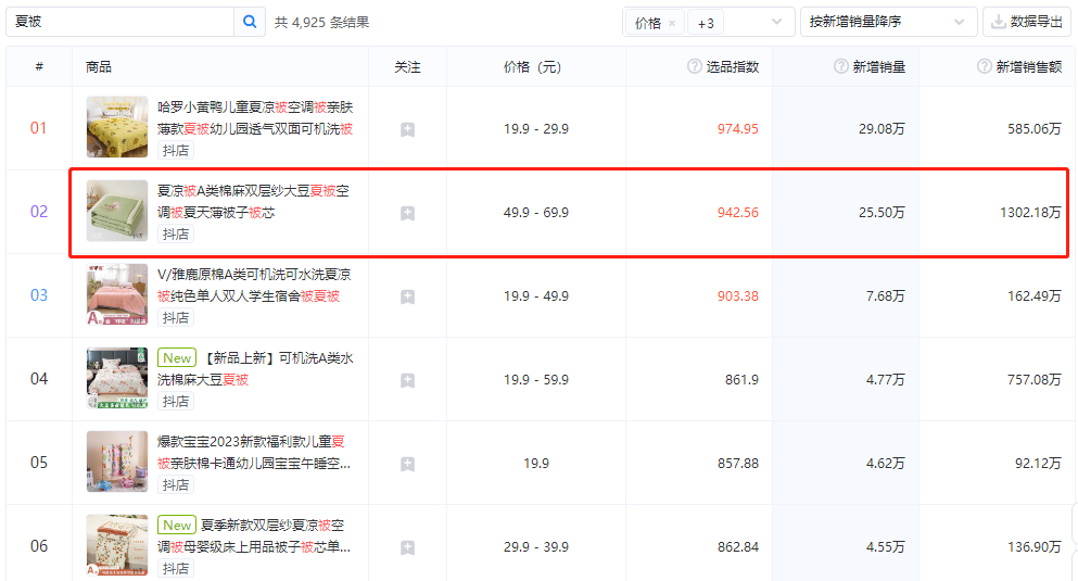 这也直接体现在销量上。据有米有数显示,近30天(2023.3.30-4.28)夏被的新增销量中,“哈罗小黄鸭儿童夏被”排名第一,但综合价格、新增销售额等数据维度来分析时,则是“大豆夏被”更胜一筹。