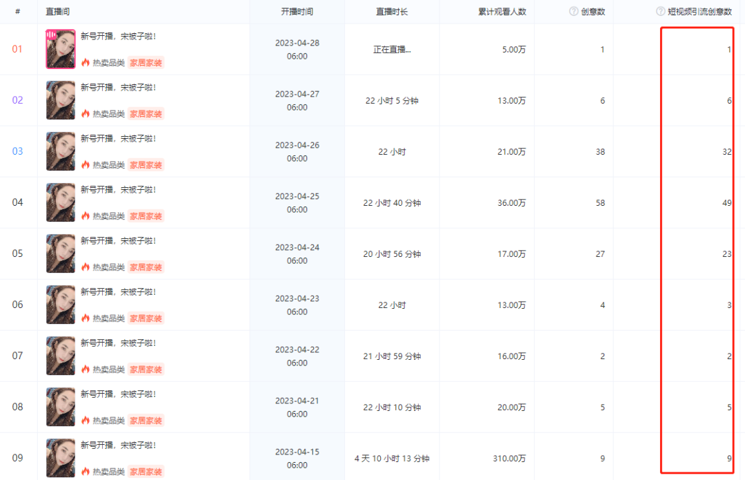 排除因产品自身优势而带动的高销量原因,我们这里进一步分析商家的直播间情况。从@布丽思家居近期的直播数据,可以发现商家在直播期间会投流小批量的引流素材,且主要以短视频引流创意素材为主。