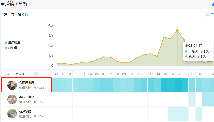 重点是,结合直播销量分析数据,我们可以发现该款夏被主要由直播带货卖出,并且主要是由账号@布丽思家居提供直播业绩,占比几乎达到100%——也即完全依赖商家自播带货。