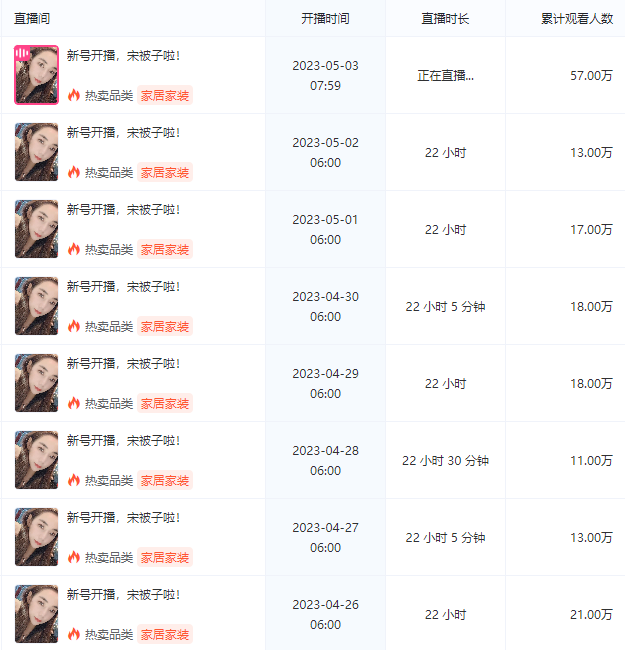 从直播时间、直播时长来看,这个商家的直播间靠长时间直播来拉高GMV,对比他们近期的直播时间表,可见其每天只开播一场,并且每天稳定在早上6点开播,一直到次日凌晨4点结束,时长在22小时上下。