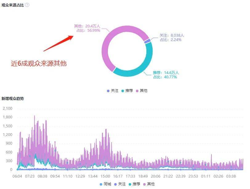 以4月25日直播为例,如图所示,来自于【关注】的观众占比不到5成,可见直播间的老粉占比并不高。另一方面,该直播间近6成观众来源【其他】,也就是来自直播广场、Dou+、Feed等渠道,我们可以由此判断“微付费”是该商家的主要引流手段。