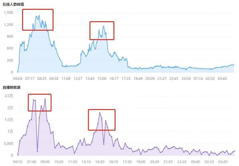 比如上方这个直播间,来源【推荐】的观众占比有4成,并且结合新增观众趋势来看,可发现它的推荐流是以一个不断进人的节奏涌入到直播间。从在线人数峰值趋势图、直播销售额趋势图来看,直播间人数峰值先后有两大高峰,但也同时造就了直播间的销售两大高峰,可见商家自播的时候都成功承接好这两波流量了。