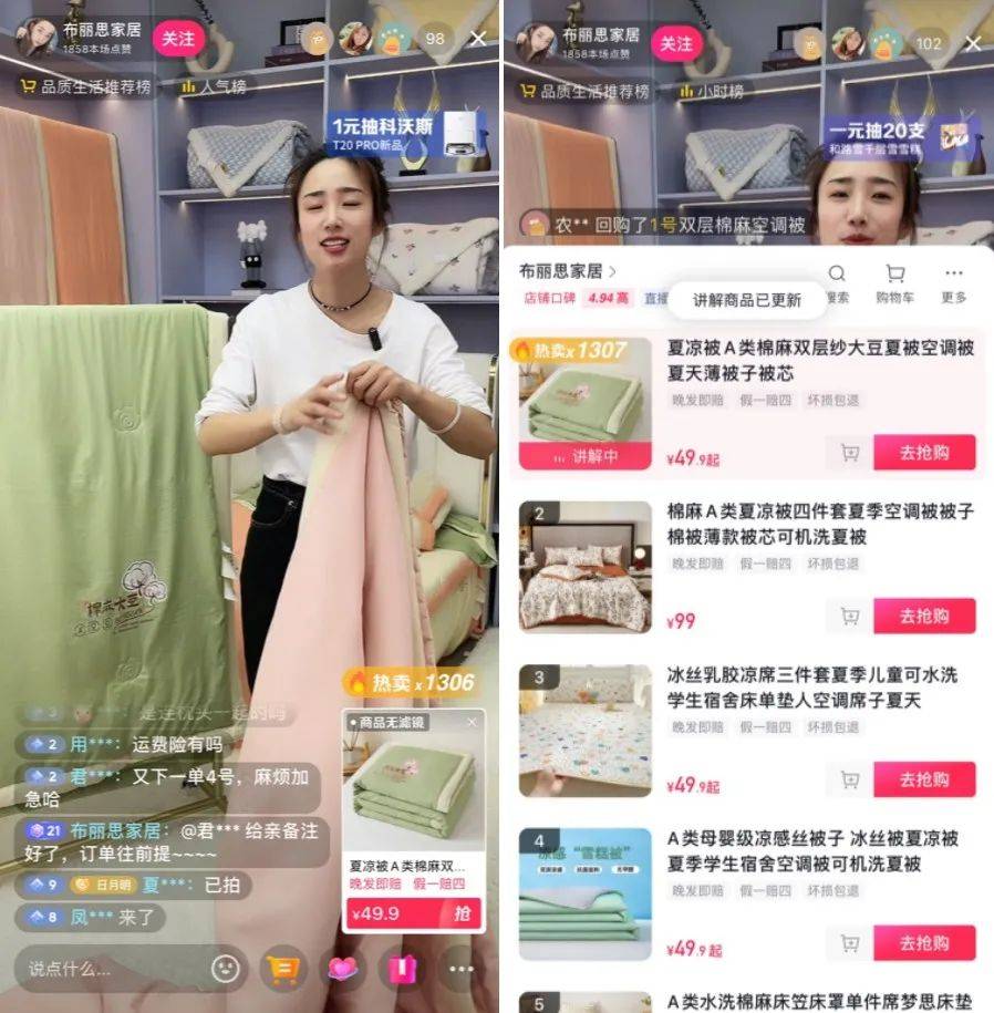 最后,我们再来详细分析商家的直播间运营情况。从@布丽思家居的直播列表,可以看出直播间一直以“新号开播,宋被子啦!”的主题开展,为观众营造一种“赶紧抢福利”的氛围,提升用户的点击率。