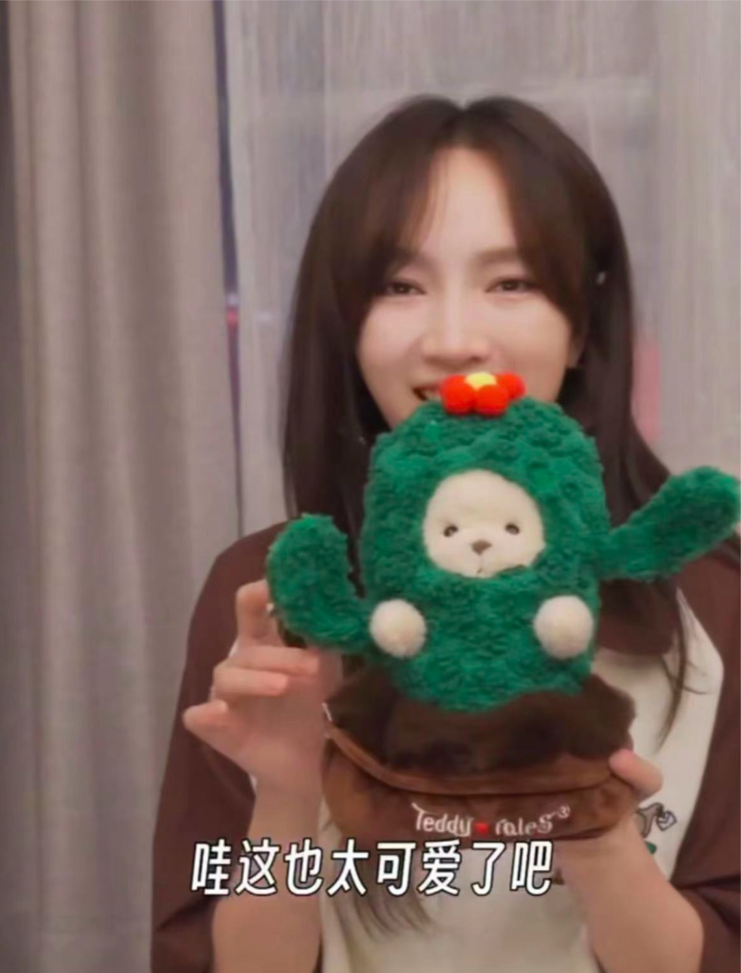 孟佳在视频开头拆盲盒,还拆开了一个礼物,是个莉娜熊……