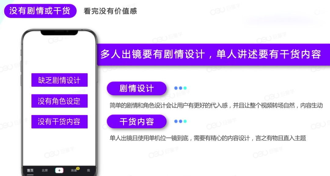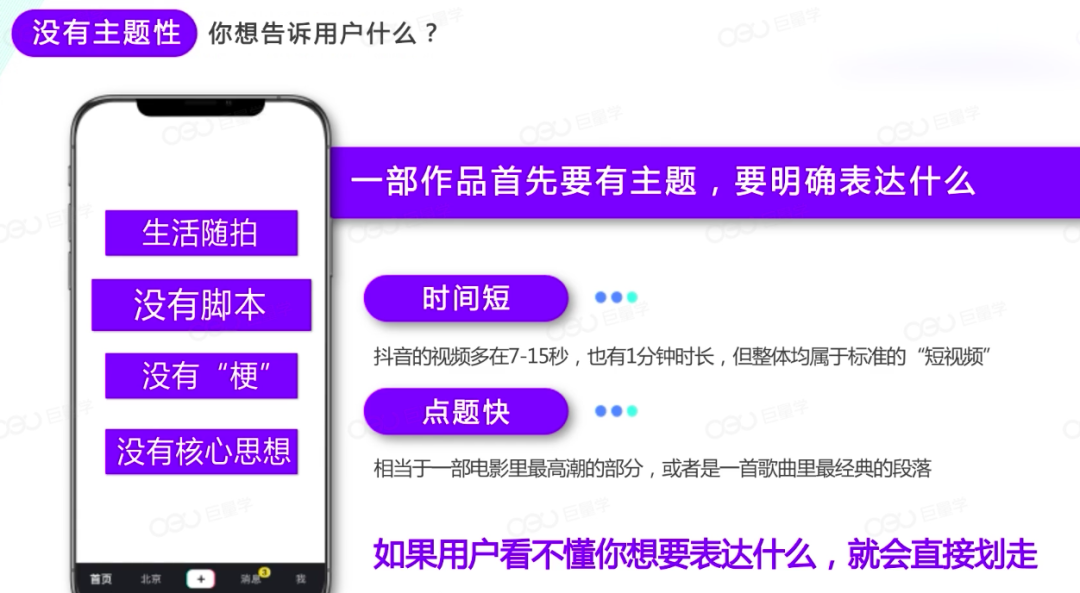 一部作品首先要有主题,明确表达到底要讲什么,要时间短、点题快,短视频要快速点题,相当于上来就展示高光部分,在这个过程中用户如果看不懂你要表达什么,就会直接划走,那么你就不会获得更多推荐。比如:生活随拍,没有脚本,没有"梗"以及没有核心思想,这样的内容得不到更多的推荐。