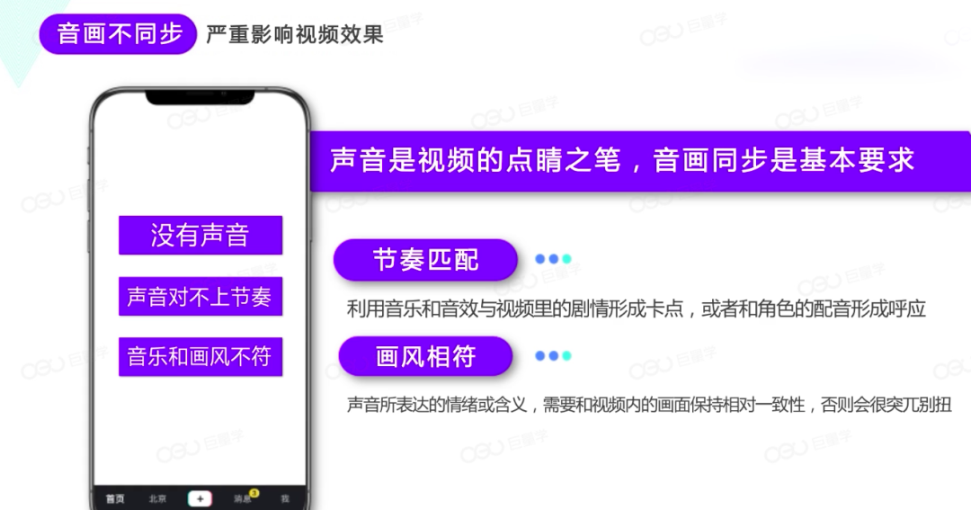 音画不同步会严重影响视频的效果,声音是视频的点睛之笔,音画同步是基本要求。比如:一个恐怖电影的高光部分,突然配上非常欢快的音乐,瞬间就没有那么恐怖了。抖音短视频也是如此,如果你的声音和画面不符,或者声音和节拍对不上,会导致用户观看体验变差。