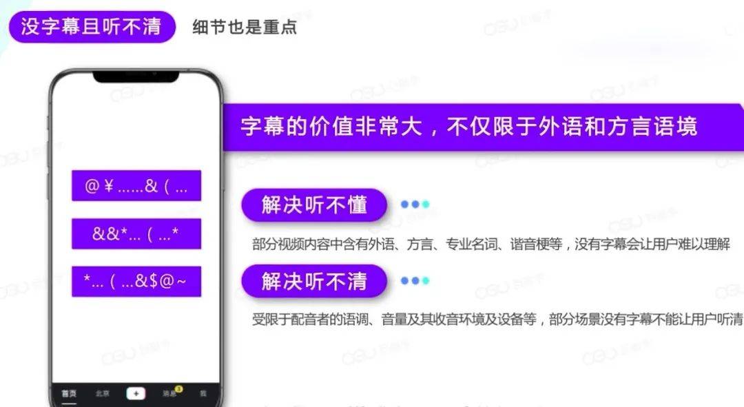 字幕的价值非常大,不仅局限于外语和方言,要解决听不懂和听不清的问题。因为配音者的语调、音量以及收音的环境和设备,其实都有所差别,如果部分场景里没有字幕,就容易让让用户不知道你要表达什么,加上字幕可以让用户非常轻松的体验到你想要表达的是什么内容,还能够起到强调的作用,比如:可以在字幕上加特效或者变颜色,让用户知道你想要表达的重点内容。所以,字幕细节也是重点。