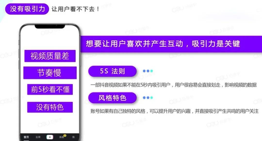 没有吸引力的作品,容易让用户看不下去,比如:视频的质量差、节奏慢、前5秒看不懂以及没有特色等,想让用户喜欢并产生互动,吸引力是关键中的关键。要遵守5s法则,如果一个视频在前5s不能吸引用户,用户就容易直接划走,这样会影响视频数据,进一步影响你的推荐。