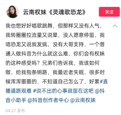 就如权妹曾在抖音上写下的一段话“我也想好好唱歌跳舞,但那样又没有人气,我转圈圈拉流量又说晕,没人愿意停留,我唱空楼又说我发疯,没有大哥支持,一个普通人做抖音为什么就这么难。”