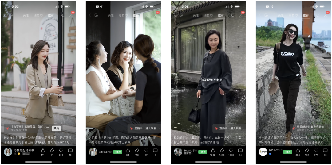 这种风格就经常出现在形象搭配师乔教主、三姐妹、Superli、啄木鸟等女装账号中。用户的产生点赞、评论等行为都是被内容塑造的情绪感染,在评论区中多半留言是对于文案代表的三观认同,甚至不少用户直接要起了视频同款链接。