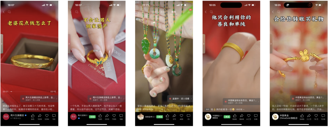 在黄金珠宝品类中,爆款短视频的内核可以定义为引起情感共鸣。以其中的一条文案为例:「一个礼物不会让男人倾家荡产,也不会让女人一夜暴富,所以送不送礼物、过不过节日、关键不是钱的问题、而是情的问题,你说呢?」