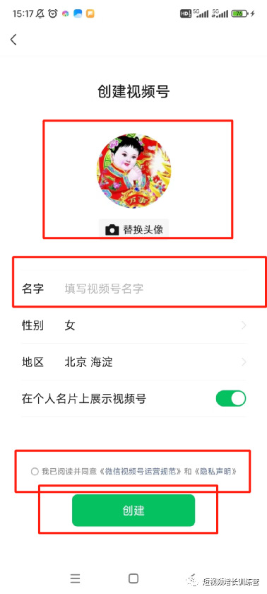 第四步:系统会弹出一个注册页面,填写个人信息,开始注册,填写完成后,勾选“我已阅读并同意《微信视频号运营规范》和《隐私说明》”,点击创建就注册完成啦