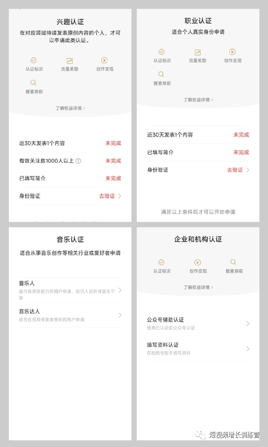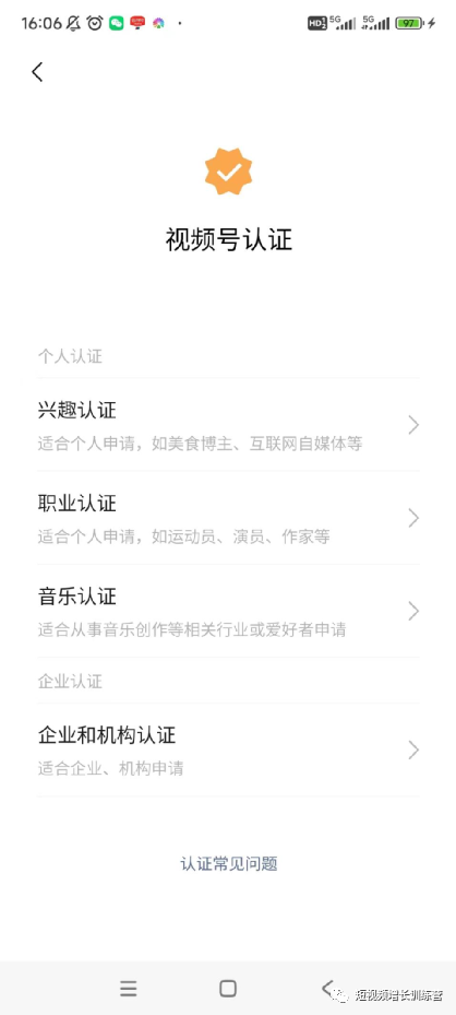创作者可根据视频号账号的主体身份选择合适的认证类型。