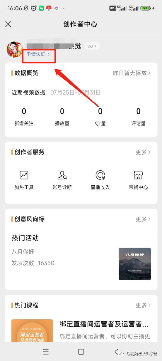 第二步:进入创作者中心,点击“申请认证”
