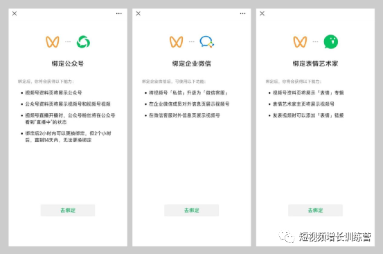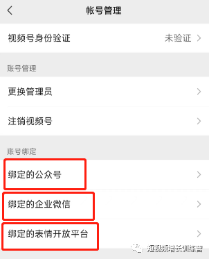 退出当前页,回到上一页点击“账号管理”,可以把视频号和公众号、企业微信、表情开放平台绑定。