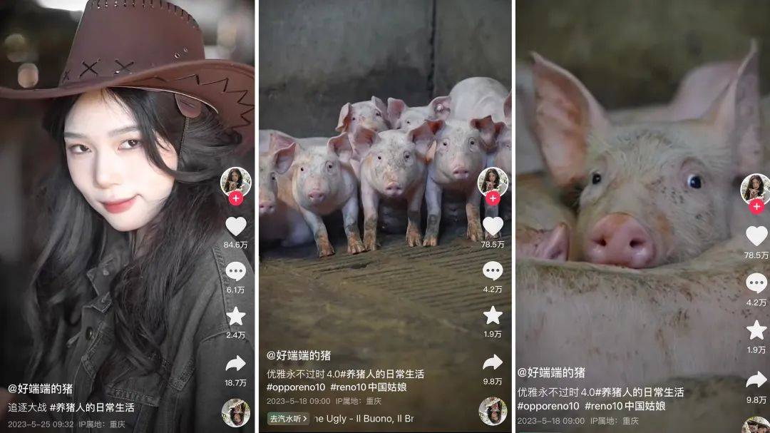 青春靓丽的美少女,身着时尚华美的衣裳,悠闲地穿梭于猪群中,熟练地做着与养猪相关的各种活计。在此基础上,创作者在运镜、剪辑、音乐、构图等层面也十分考究,在她的镜头呈现下,喂猪、修猪圈、阉猪等一系列活动变得高贵优雅,颇具艺术感。与此同时,不时被精妙捕捉的猪的微表情,不仅让整个画面更加生动有喜感,也让人和猪之间的互动多了更多看头。