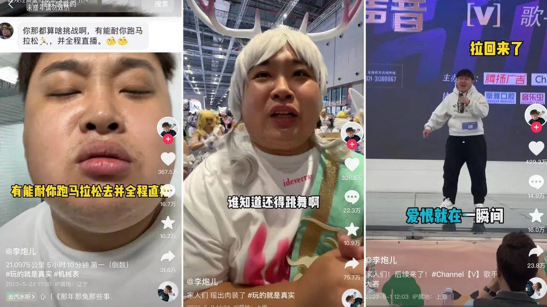 此外,榜单上还夹杂了少量近期活跃度很高的“老”账号,典型的如挑战型达人@李炮儿,其发布的内容聚焦于记录自己完成粉丝提出的各种挑战主题,比如“去美甲店做美甲,并选择超级加长款”“挑战去鬼屋吓鬼”“挑战带开锁师傅去玩密室逃脱”等。5月,他将挑战难度升级,不仅“挑战全程跑马拉松”“挑战当一天电竞职业选手 ”,甚至跑去《中国好声音》参赛、去漫展当起了coser……逐渐升级的挑战难度背后,是更多打破常规的笑料和惊喜,与之伴随的,则是账号粉丝量的不断增长。