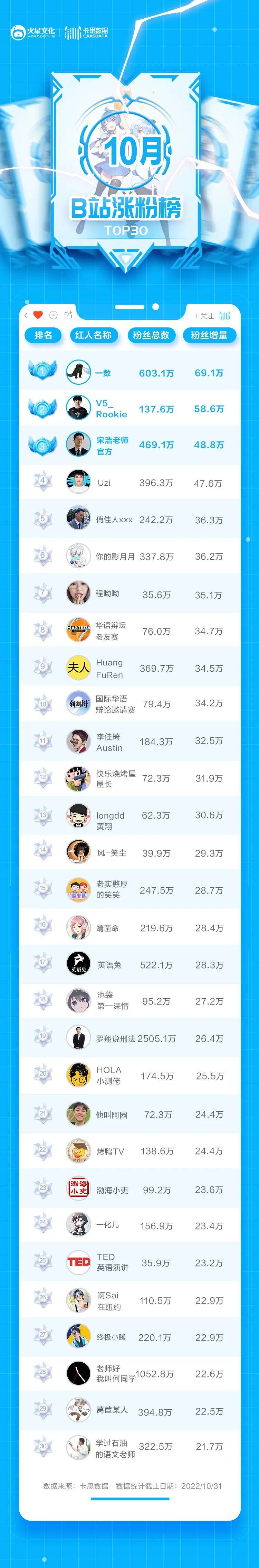 B站10月涨粉榜新鲜出炉,你关注的UP主有没有上榜呢?我们一起来看。