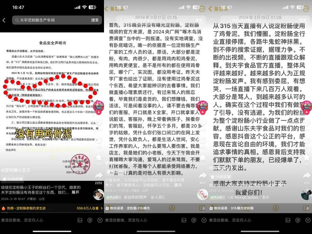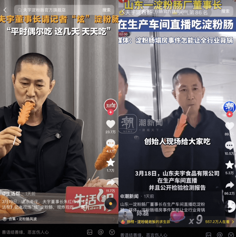 3月16日,山东夫宇食品有限公司发布食品安全声明书并公开生产流程。声明称:“2024年3月15日下午,枣庄市、区、镇市场监督管理部门对我公司现场进行突击检查,检查中我公司生产的食品未使用各种骨泥等原料,符合国家食品安全标准。” 18日,为自证清白,夫宇在自家生产车间开启直播,董事长现场吃烤肠,直播间实时观看人数突破2万人。