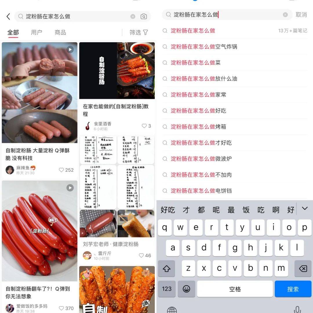 在小红书上,#淀粉肠在家怎么做#迅速登上热门搜索词,超过13万篇笔记详细地介绍了淀粉肠的自制过程,从剁肉泥到灌肠、煮肠,让前两天大呼“不敢再吃”的吃货们,成功在家实现了“淀粉肠自由”。