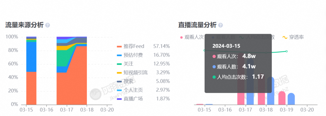 值得关注的是,“3·15”晚会前,该直播间的流量来源中近60%都来自付费流量,仅30%左右来自“推荐feed流”,也就是平台推荐,但自3月17日开始,平台推荐流量开始上涨至约50%,3月18日更是上涨至80%。不难发现,以“3·15”为爆发节点,负面事件引发的流量同样惊人,而淀粉肠得以“掰回一局”,既有主播和品牌方的“不甘”和自证清白,也有平台携流量助攻、放大的影子。