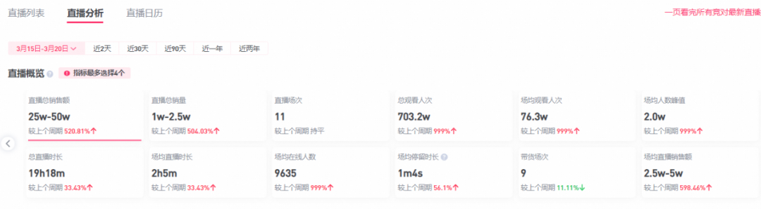 数据显示,3月15日—20日,“淀粉肠小王子”直播间总销售额达25万—50万元,环比上涨520%;销量10000—25000件,环比上涨504%;总观看人次703万,上涨超999%。