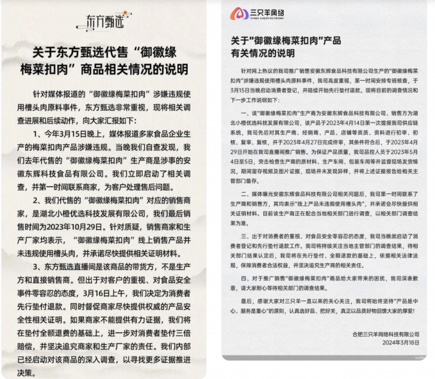 3月18日,东方甄选和三只羊网络先后发布公告,承认带货过该款梅菜扣肉,并为此致歉。其中,东方甄选回应称在全额垫付退款的基础上,为消费者进行三倍赔偿。按照王海统计的销售额,东方甄选或将面临着超过1200万元的退赔金额。三只羊网络方面则表示,当晚就启动了消费者登记和先行垫付退款工作,并将持续关注当地主管部门的调查结果。