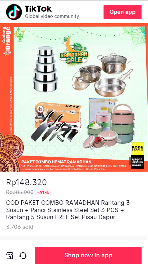 通过数据统计,可以看到这款这款商品名为【COD PAKET COMBO RAMADHAN Rantang 3 Susun + Panci Stainless Steel Set 3 PCS + Rantang 5 Susun FREE Set Pisau Dapur】的厨具套装的真实销售数据,这件商品于2月25号上架,前3天基本在铺货阶段,没有什么销量,在2月28号这天突然爆单,卖出2200件,到3月2号3天的累计销量达到3600+。