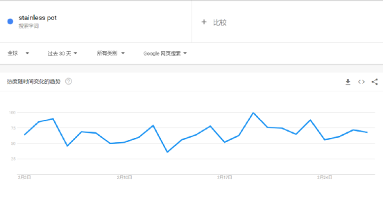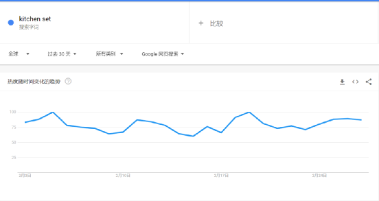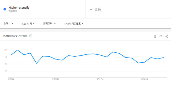 通过Google Trends检索商品关键词在搜索引擎的热度,可以看到在过去的30天中,全球关于厨具套装、不锈钢锅、厨房设备的搜索热度都有了一定程度的回升,也反映了消费者对产品的需求开始提升,传导到购物链条,就是该品类话题度的上升。