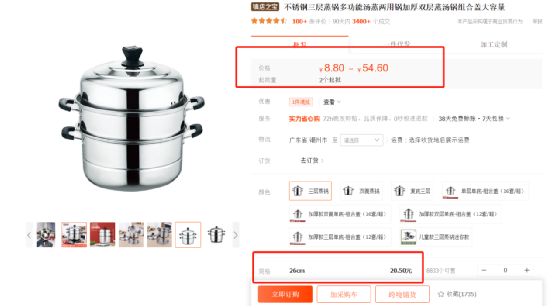 检索1688货源网站,发现同款产品最低只要20.5元,约合2.97美元,不过这款锅具没有赠品,配上相关赠品总价也不会超过5美元,利润空间还是相当高的。