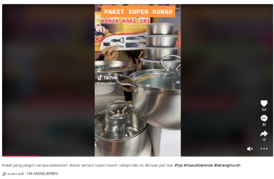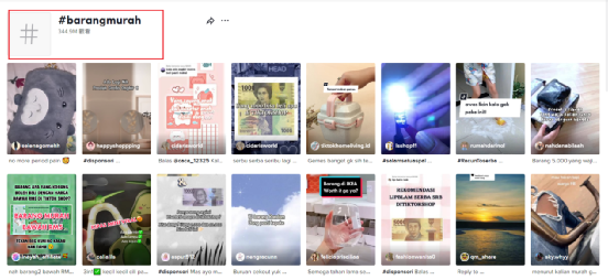 根据视频所带的标签#barangmurah(便宜的东西)进行检索,发现其在TikTok上也达到了3449W+的曝光量,每天有来自世界各地的上传的自己新入手的好物,虽然该商品的视频不在首页,但凭借合理的利用标签,得到了相当程度的曝光,热度不断。