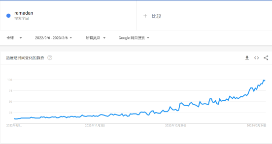 斋月的市场需求正在产生,从谷歌趋势上可以看到,最近180天关于斋月“ramadan”的搜索热度呈非常明显的上升趋势,反映出新一轮的斋月经济正在推进,商家的营销活动也应该紧锣密鼓地进行。
