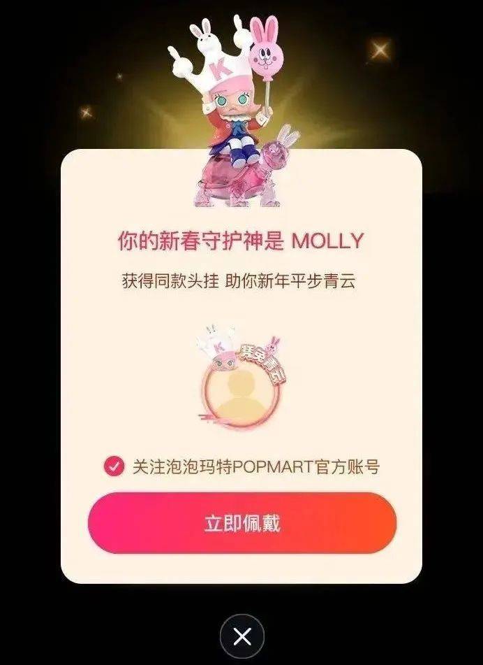 比如在抖音“温暖中国年”活动中,泡泡玛特将线下火爆的“抽盲盒”概念搬到了线上,用户可以通过游戏抽盲盒的形式,获得泡泡玛特新春IP头像挂件,再加上各种互动营销玩法,使得泡泡玛特抖音官方账号的粉丝量得以在活动期间飞速增长,跃居涨粉榜榜首。
