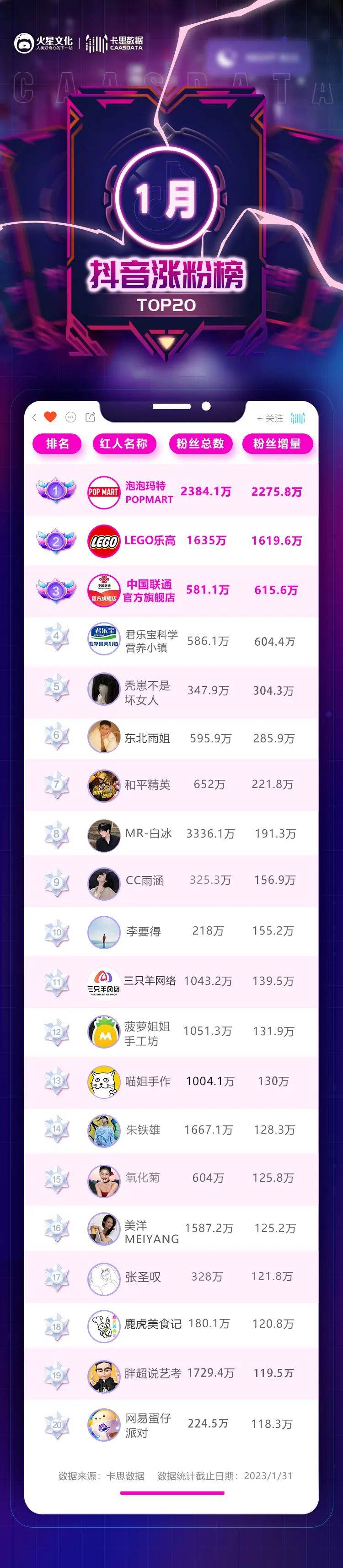 乍一看去,榜单中排名前4的账号粉丝增量均在500W以上,似乎呈现出了“锐不可当”的气势,但仔细观看,这几个账号均是品牌账号,之所以能在1月实现高速涨粉,基本源于他们在春节期间与抖音达成了合作营销。