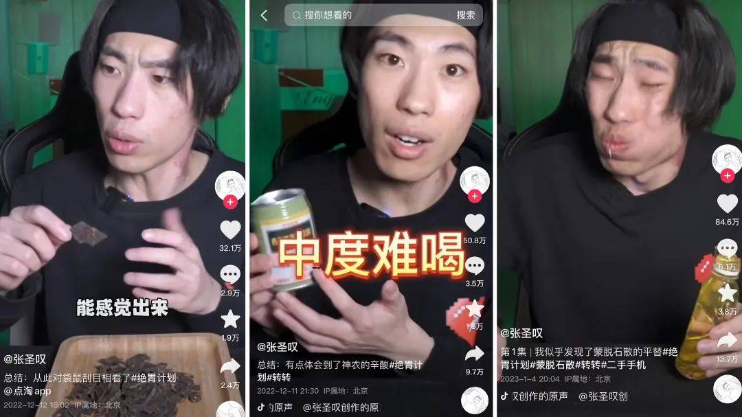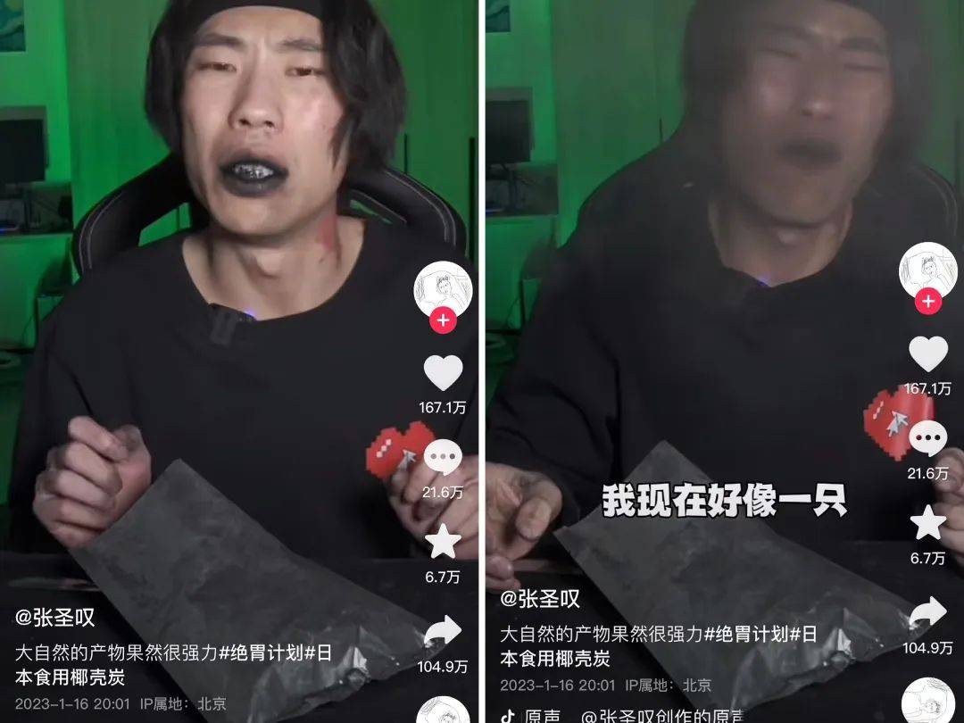 比如在1月16日发布的作品中,@张圣叹品尝了网友寄来的可食用活性炭,满满一大勺下肚之后,他顷刻间吐出大量黑烟,直接化身为移动的双弹瓦斯,整个场面荒诞却又喜感,引来众多网友驻足,视频共收获167.1W点赞。