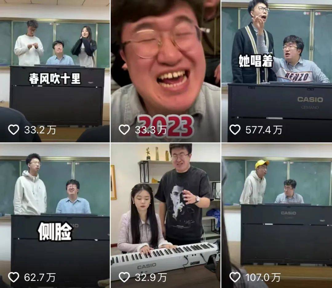 其发布内容主打记录声乐老师和艺考学生的“沙雕”日常。破音、跑调的学生,和拿出十八般乐器配合学生找调的老师碰撞出了无数笑料,让用户看得乐此不疲。在后续创作中,账号一方面不断加入新人物强化戏剧效果,另一方面则紧跟热门歌曲和热门话题进行创作,以持续吸引用户的观看热情。