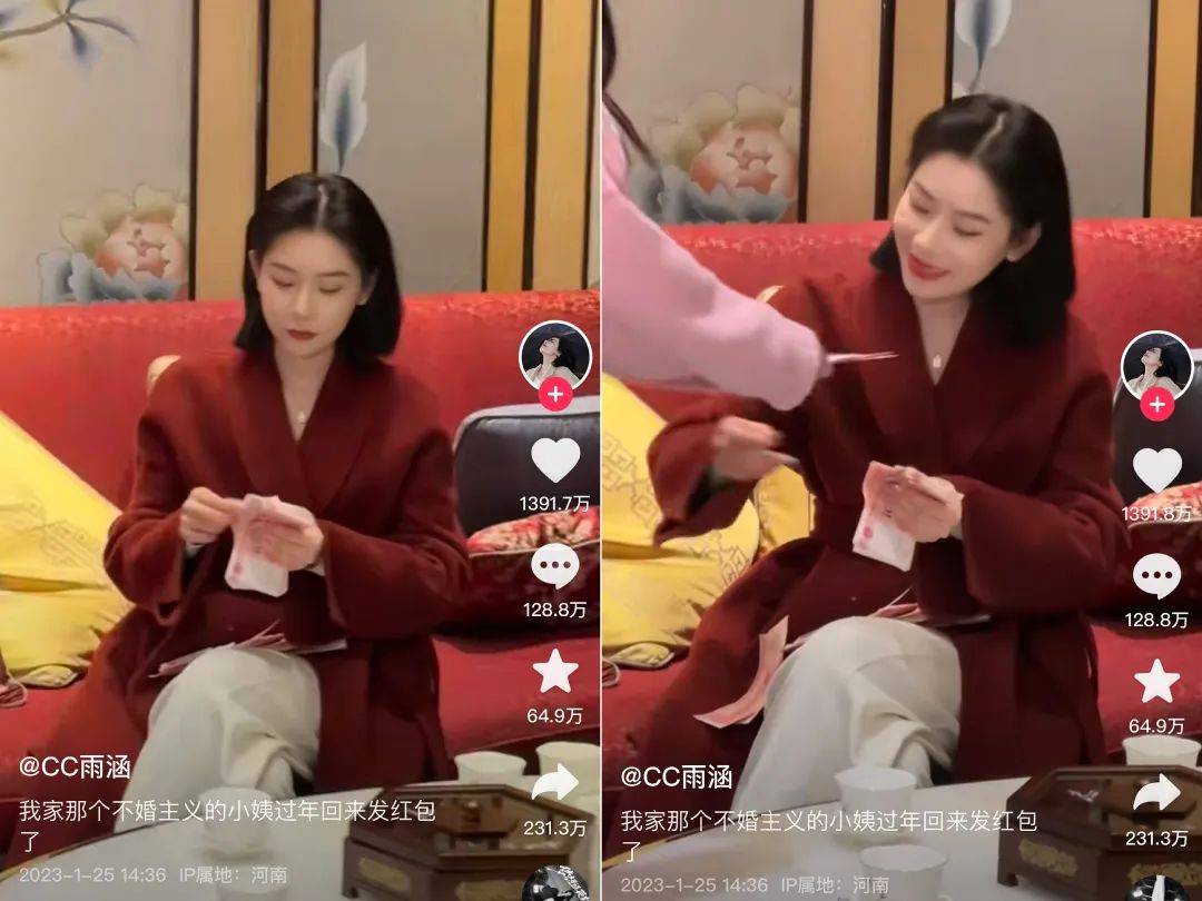 视频中,端庄靓丽的小姨优雅地坐在沙发上,然后依次将手中拿着的一沓钱发给了家中的小孩,整个过程尽显从容淡定,完美展示了未婚女性经济独立、自信、美丽、有涵养、不在乎世俗非议的积极面貌。再借势春节节点,让这条视频发出两天后点赞量就突破千万,截至目前,该视频点赞已接近1400W,而@CC雨涵也由此一周涨粉超百万,迎来了更多人的关注。