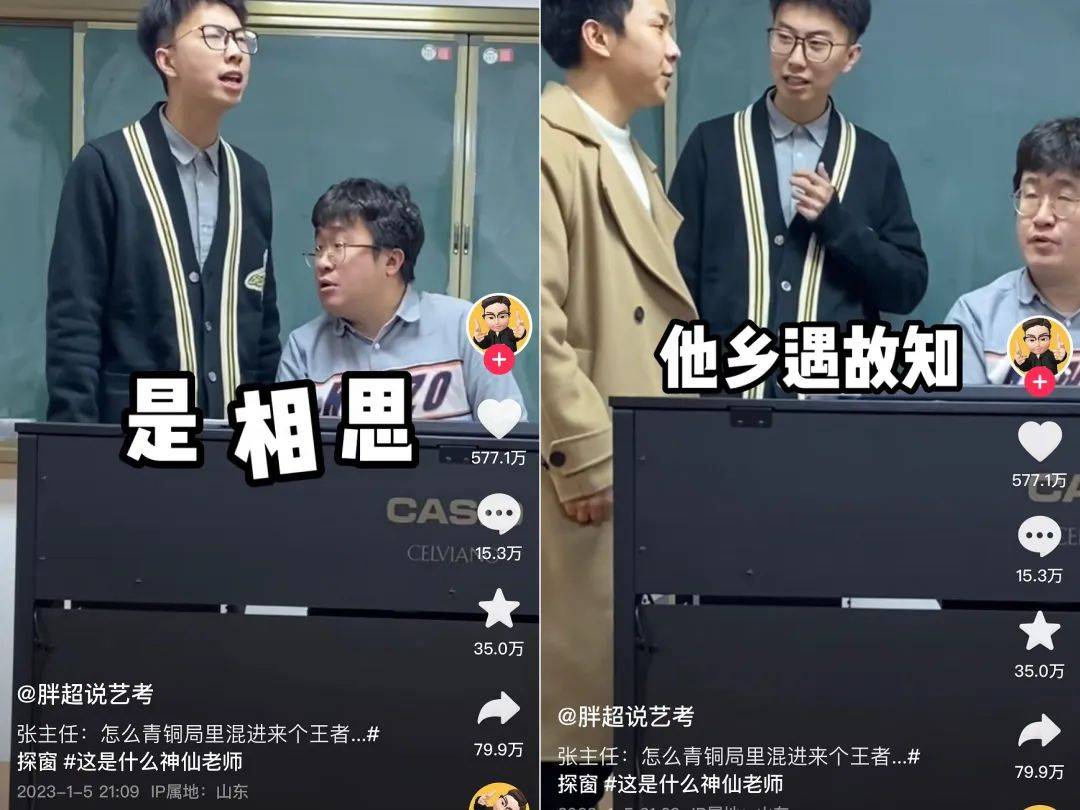 在@胖超说艺考1月5日发布的视频中,张主任卖力地引导着“青铜”学生演唱戏腔古风歌曲《探窗》,无奈被学生的不争气搞得丧失了信心,随后他又随机指了一个坐在台下的学生上台演唱。谁料,男生一张嘴便呈现出王者风范,细腻动听的唱腔让在场的学生投来了赞许的眼神,演唱完毕后,张主任不自觉地站起身来,站在旁边的青铜则顺势把王者拉到椅子旁,嘴里说着“老师坐”。