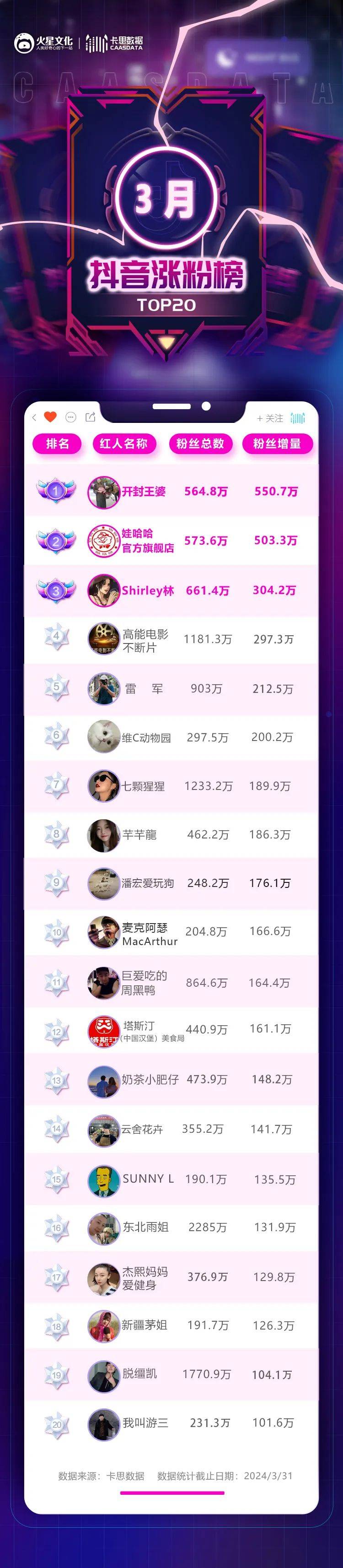 整体来看,3月的涨粉走势维持着近两年来惯有的“波澜不惊”,并不出彩。但值得关注的是,3月涨粉榜不仅覆盖了音乐、影视、宠物、美食、户外、运动健身、剧情、vlog等多个垂类,上榜账号还呈现出了新鲜面孔占据半壁江山、风格化账号层出不穷的特点,这也意味着,只要内容有亮点、有特色,依然能在抖音内容生态中冒出头来。