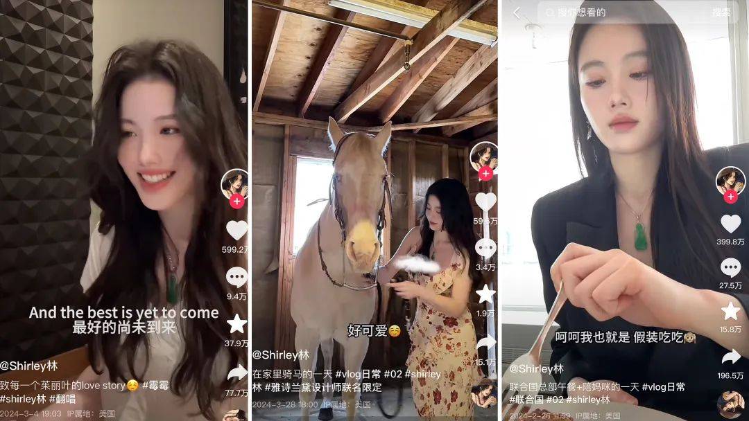 这两个账号之外,增粉量在300W-500W之间的账号还有一个,是美女音乐达人@Shirley林。和一般的音乐达人不同,@Shirley林 除了分享自己唱歌的视频外,还会分享自己的生活日常:去联合国总部吃午餐、在自家花园里骑马、参加比尔盖茨的晚宴等等,奢华高端的做派引来一众网友对其身份背景的猜测,账号也由此笼罩上了一层神秘色彩,从而吸引了更多人群关注。