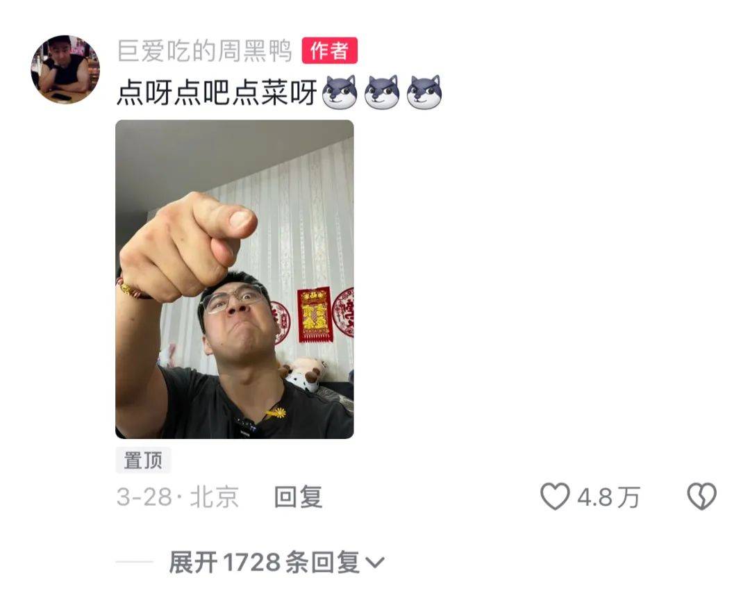 分析其原因,一方面,是因为周黑鸭加强了与粉丝之间的互动——他会在评论区中置顶“点菜区”评论,由粉丝来决定他吃什么,这种做法让粉丝的参与感更强,也让他和粉丝之间的联系更加紧密。