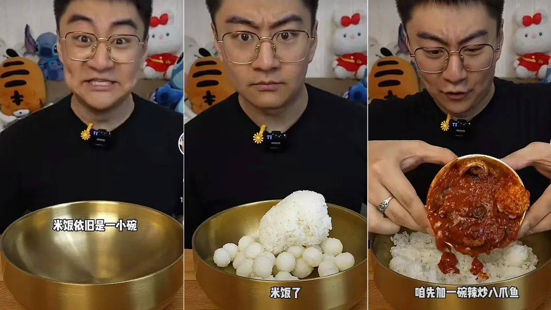 具体来看,在很多视频中,周黑鸭都会在正式开吃前来一句“米饭依旧是一小碗”,但嘴上说着一套,行动却截然相反:每次他都会使出各种手段出其不意地给自己加饭,不是在加食材的过程中莫名其妙从四面八方降下数个饭团,就是将饭团藏在各个角落,有时甚至直接从脖子上搓下一团米饭,或是嘴里藏一块米饭,不少网友因此称呼他为“米饭投手”,甚至有粉丝戏称“新粉在看他吃饭,老粉已经在找米饭了”。