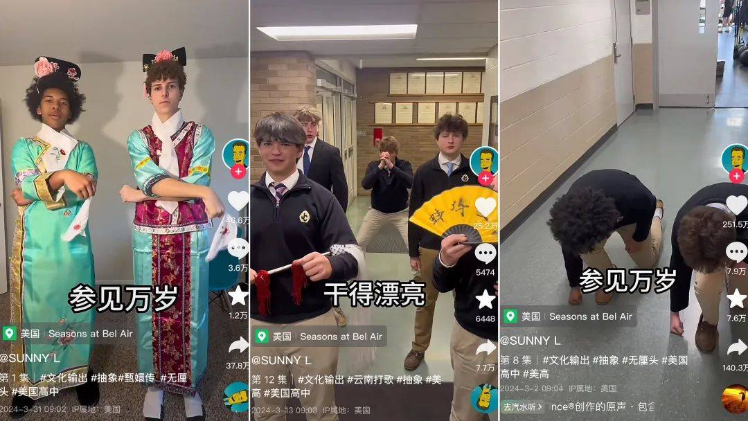 在其发布视频中,五六个美国高中生在SUNNY L的指挥带动下,用蹩脚的中文上演着一段段极具中国文化特色的剧情,有时他们是宫廷里的皇妃、太监,有时他们是《西游记》中的猴子、妖怪,有时他们只是单纯地模仿着国内互联网上的热梗,比如前段时间的“谢帝谢帝我要diss你”……不论是演绎何种剧情,几个美国高中生都认真且卖力,强烈的反差感和不同文化之间的碰撞带来了让人忍俊不禁的喜剧效果。