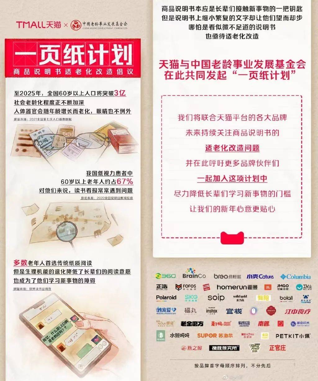今年年货节,天猫联合中国老龄事业发展基金会共同发起“一页纸计划”,提出商品说明书适老化改造倡议,降低商品说明书使用门槛,让长辈们也能无障碍使用新产品。