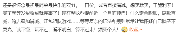 此外,消费者对“双十一”为代表的节点营销的争议,还落脚在愈加复杂烧脑的玩法。