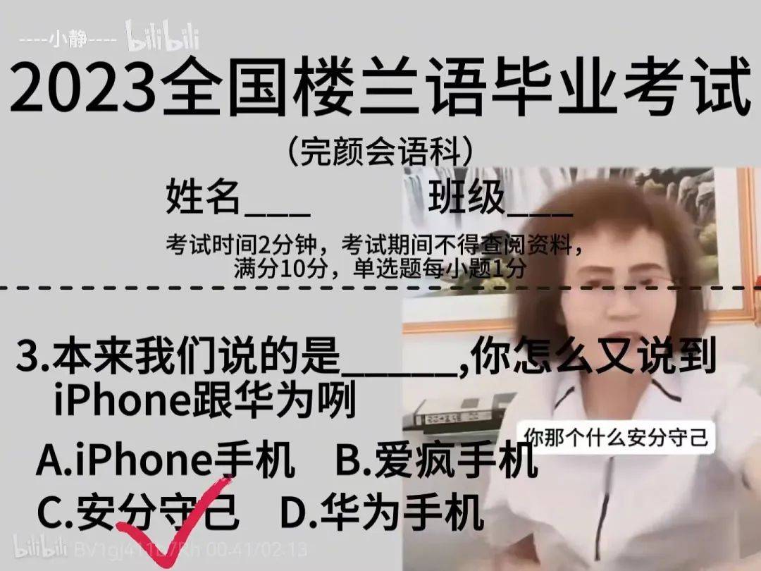 在抖人热捧下,完言慧语迅速流传开,B站UP主惯例产出鬼畜视频,其中甚至包括一份“名场面考试问卷”。