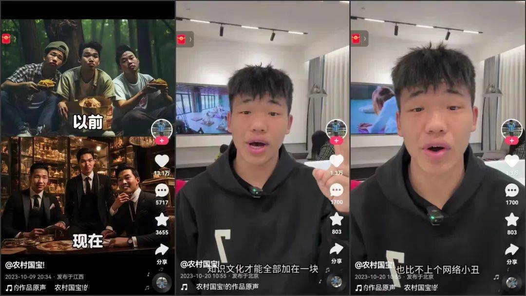 当然,被土味网红们的“泼天富贵”震碎三观这回事,实际上早就不新鲜了。曾经向篮球运动员吴勇豪“下战书”、被痛批污蔑篮球运动的@农村国宝,在过往直播中声称自己高中未毕业,两三年赚的钱有六亿九千万。虽然这个数字大概率不属实,但也足够引发一场“读书有用”与“读书没意义,不如当网红”的价值观论战了。在他的新视频中,网友们惊讶地发现,农村国宝又买了一套婚房,甚至篮球技术也精进了。