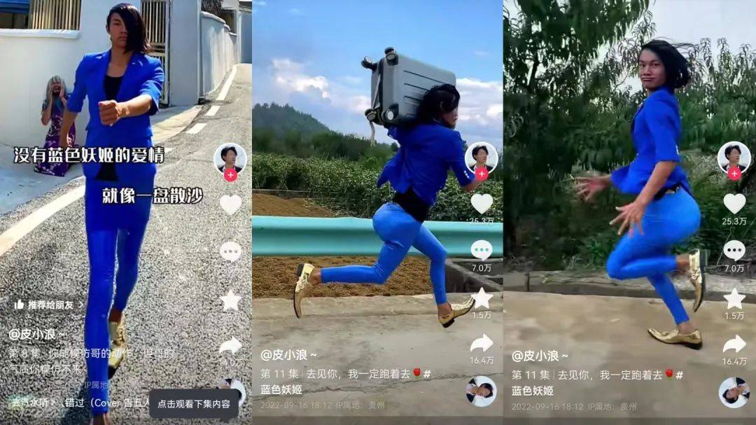 当然,当代人对于“土味”的追求不止于方言,往前数还有留着杀马特造型,身穿蓝色西服与紧身裤,脚踩金色“切尔西”的蓝色妖姬。去年10月,创造“蓝色妖姬”形象的博主皮小浪大火,其视频套路可以概括为:表白被拒或被戴绿帽后,主角化身蓝色妖姬肆意奔跑,偶尔产出土味语录,如“蓝色妖姬你不爱,非要在渣男身上找存在”。