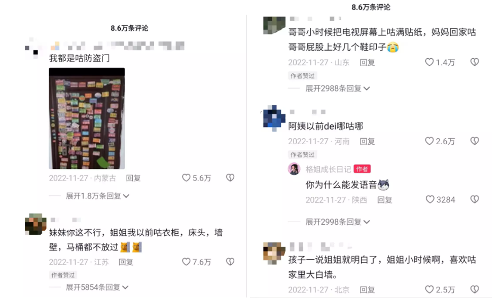 评论区中有网友晒图表示:“我都是咕防盗门。”还有网友评论说:“哥哥小时候把电视屏幕上咕满贴纸,妈妈回家咕哥哥屁股上好几个鞋印子。”